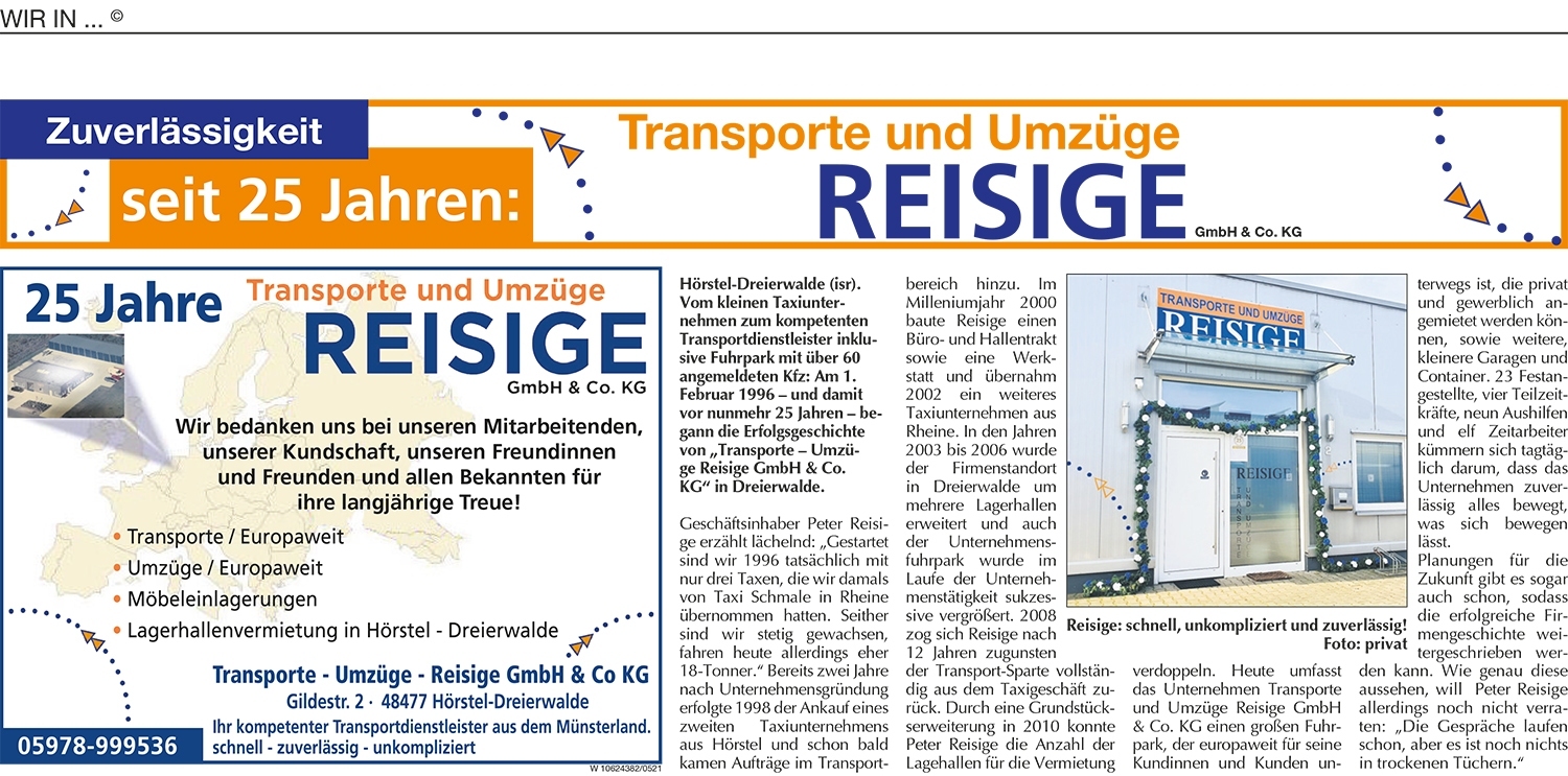 Transporte und Umzüge Reisige in Dreierwalde: 25 Jahre Wachstum - Anzeige Hörsteler Stadtmagazin / März 2021